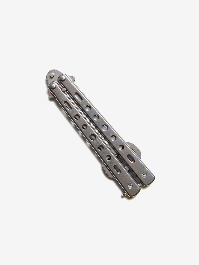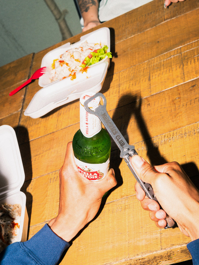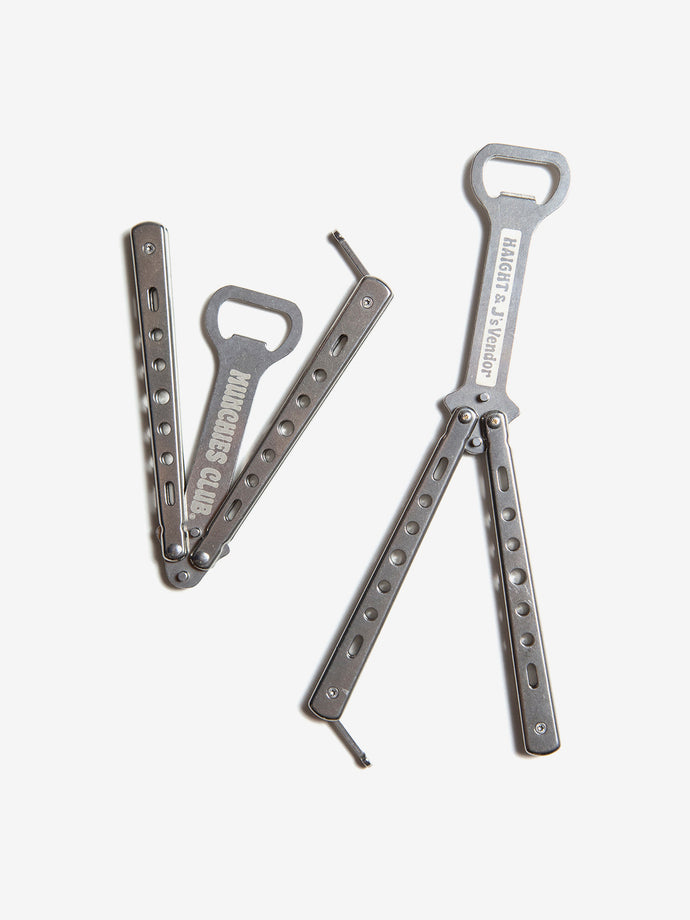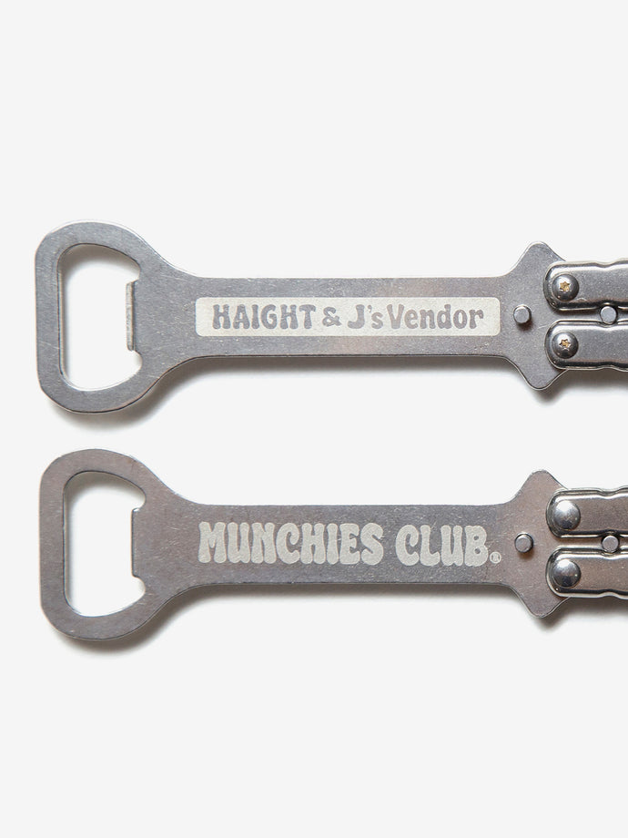 原宿のチキンオーバーライスの名店 "J’s Vendor" とのコラボプロダクト「MUNCHIES CLUB」。バタフライナイフ風ギミックで魅せるボトルオープナー。実際にはナイフではなく、開閉ギミックを楽しめるボトルオープナーとして仕上げた遊び心満載のアイテム。栓抜き部分にはレーザー刻印でMUNCHIES CLUBのロゴ、裏面にもレーザー刻印でデザインが入る。アウトドアやホームパーティーでの話題作りにぴったりな、カルチャーとユーモアを両立したアイテム。