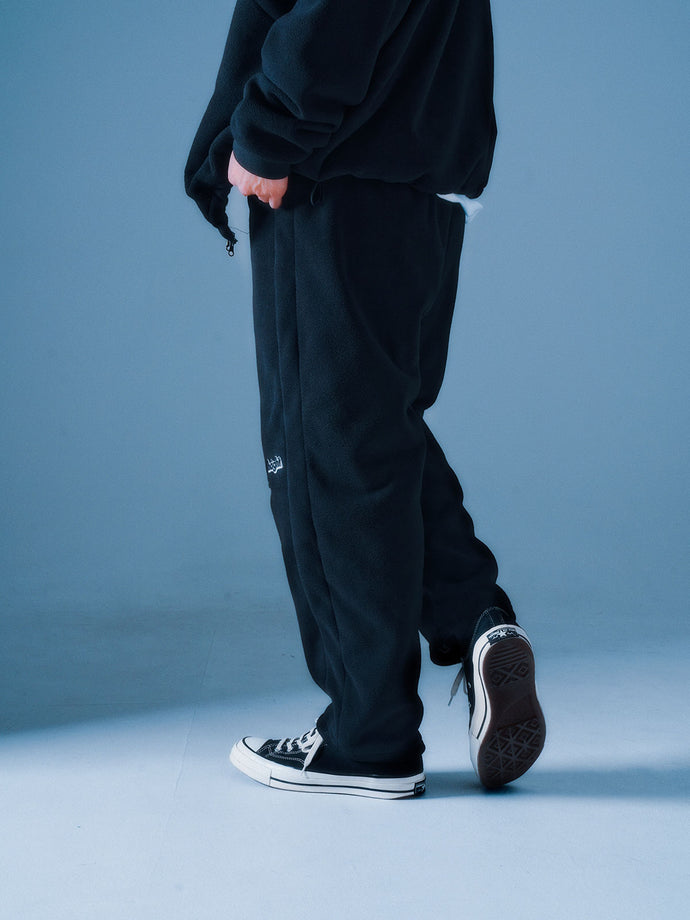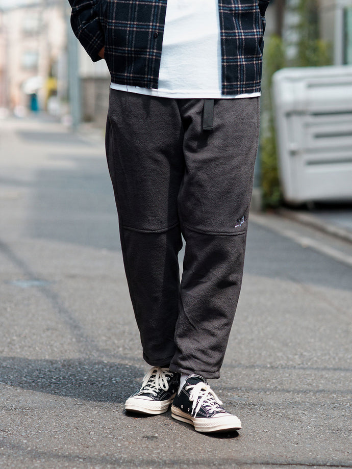 キメの細かい少し厚手のフリースをつかったパンツは幅広のワタリでゆったりとしたシルエット。