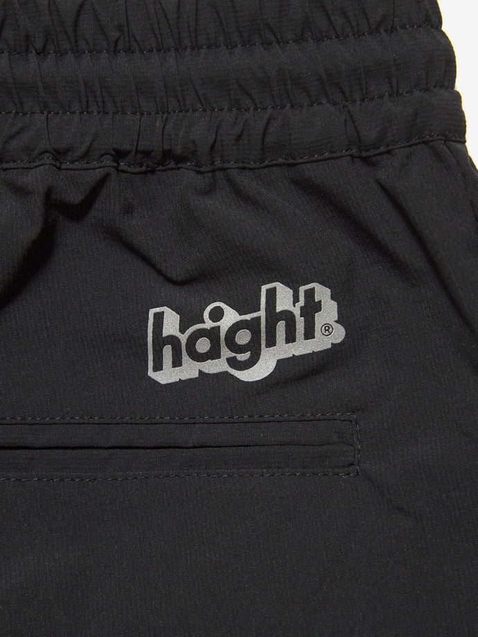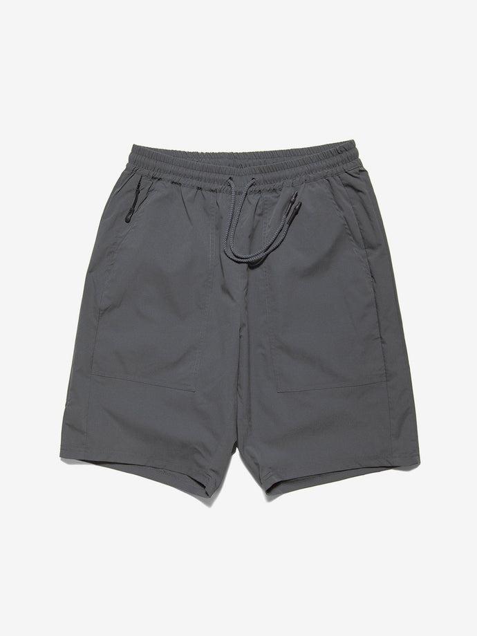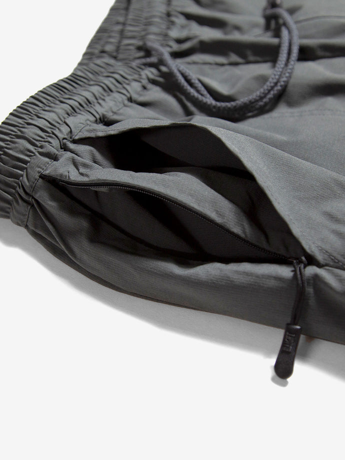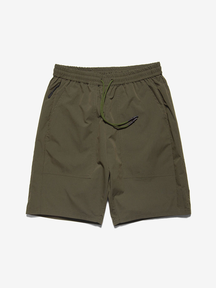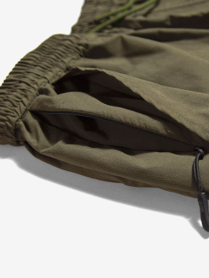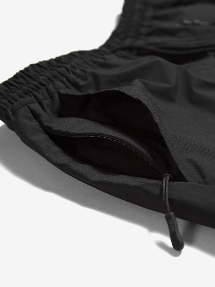 ウエストはゴムとスピンドルで調整可能。素材の特性上、速乾性も高くアクティブシーンでも重宝します。右のサイドポケットは、ファスナータイプのポケットと2層式でポケットの中身を整理でき利便性にも優れる。