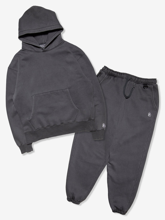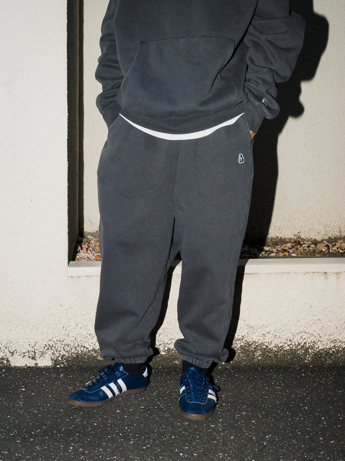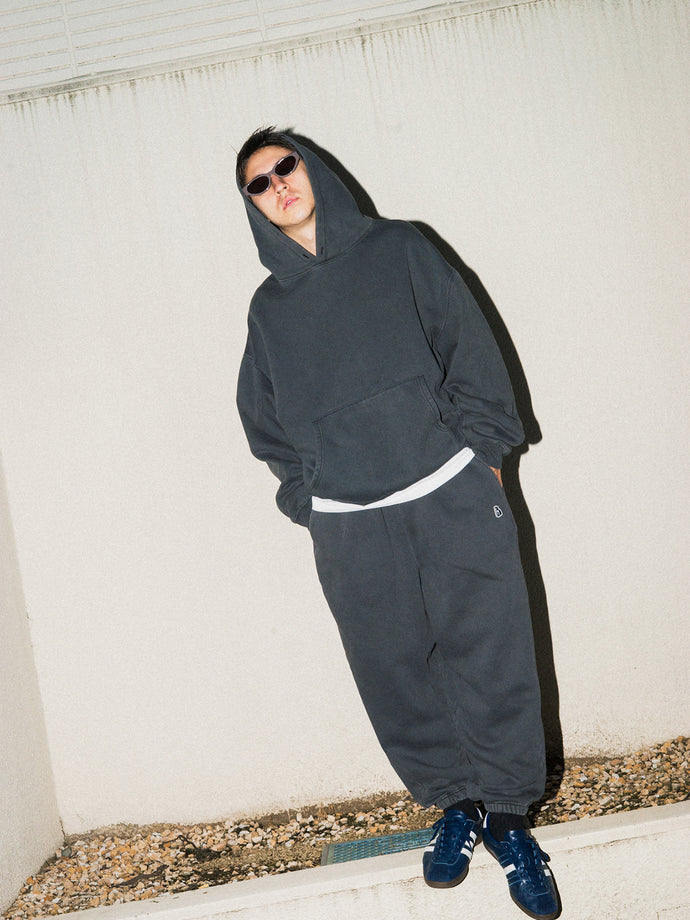 シルエットはややテーパードを効かせたルーズなジョガータイプ。同素材のフーディとのセットアップ着用で、統一感あるリラックススタイルが完成。