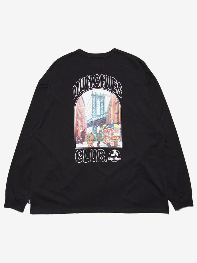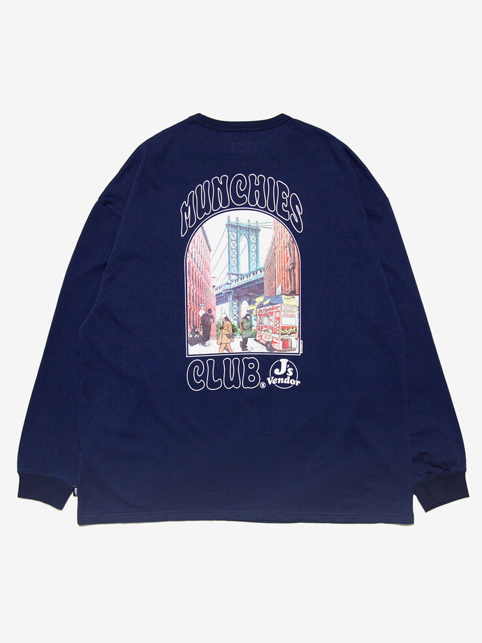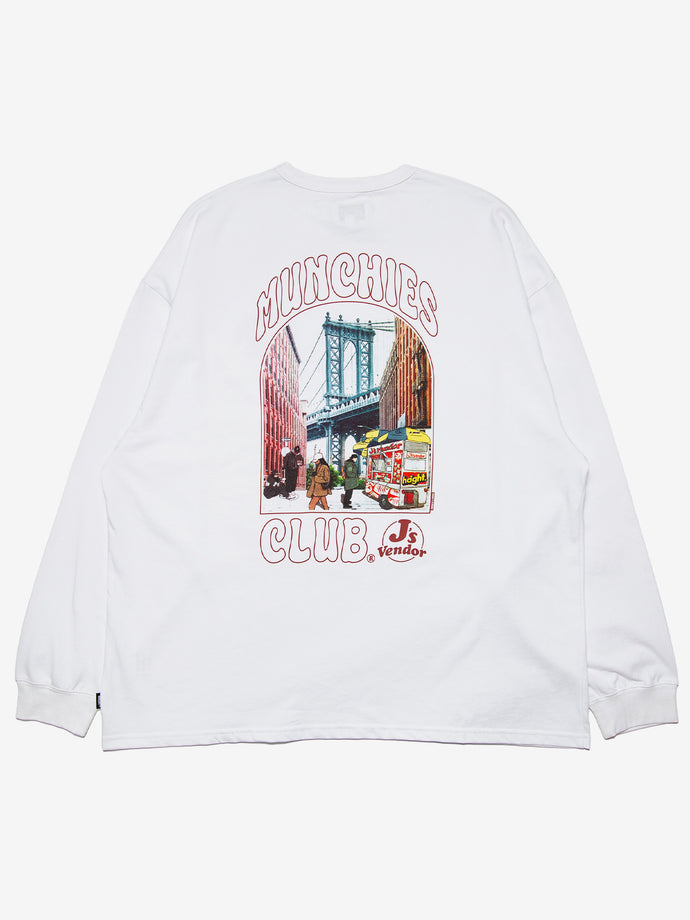 ニューヨークのダンボ地区の風景を舞台に、描き下ろしのアートで再構築したLS Tee。バックのグラフィックは、ニューヨーク・ブルックリンの人気エリア「DUMBO」の街並みに、「J’s Vendor」の屋台とキャラクターを描き下ろしで配置。ストリートのリアルな空気感と、アーティストのユーモアあるタッチが融合したビジュアルは、背面に大判でプリントされインパクトも抜群。カルチャーとアートが交差する、特別なコラボアイテムです。ボディは7ozのミドルオンス生地を使用したオリジナルシルエット。